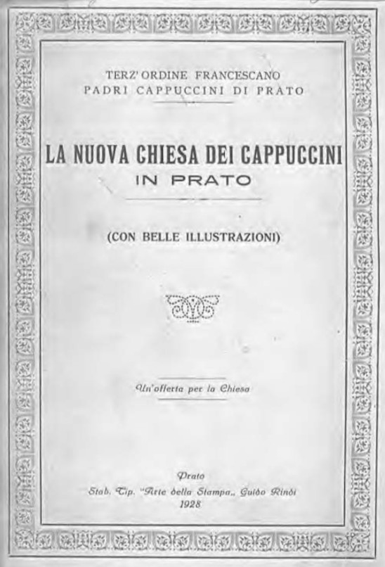 Come or sono 7 secoli al Cavaliere Ardente si faceva sentire la voce del Signore «Va, restaura la mia Chiesa», così nella commossa rievocazione centenaria del Gran Santo, Prato ascoltò la voce di Dio che si levò alta e pressante perché i RR. PP. Cappuccini avessero un Tempio più decoroso per la loro feconda opera di bene. Così sul verde declinare di una delle nostre Colline la nuova Chiesa sovrasterà alla Città che lavora, come benedizione divina, nella sua artistica espressione che l'avvicina maggiormente a Dio, testimonianza nei secoli di una nobilissima gara di fede e di un appassionato sogno di amore.